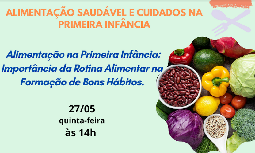 O evento será no dia 27 de maioquinta-feira, às 14h pelo Google Meet. No encontro será abordada a alimentação para crianças de 0 a 6 anos focando na rotina da alimentação e opções de cardápios práticos e saudáveis para refeições e lanches.